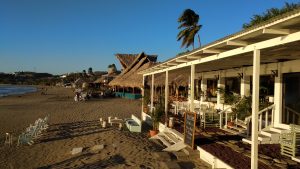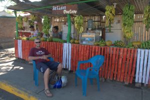 12 Feb: After breakfast, we finished packing and waved goodbye to the friendly cleaning lady at Hostel Santa Cruz before driving back towards Moyogalpa. We stopped by the airport to take a few photos of the landing strip at the base of the volcano…pretty cool! After refueling the bike, we returned it to Dinarte’s and got our $100 deposit back and 100 Cordoba for the throttle repair returned to us. We had plenty of time to catch the 11 am ferry back to San Jorge, which left on time and cost 50 Cordoba each. The German couple we ran into yesterday was on board our ferry so we got some good information on what to do in Guatemala and Belize. The ferry crossing was smooth (what a difference a big boat makes) and we hopped into a collectivo taxi for 20 Cordoba each to Rivas. While waiting at the bus station for the next bus to San Juan del Sur, a taxi pulled up and offered to drive us for only 50 Cordoba each. Deal! We kept thinking it was a scam but no scam, he just wanted to share the ride for cheap and we had a nice conversation with him all the way into town. Exactly 2 hours after we got on the ferry, we arrived to our hostel…not bad, 2 hours for door to door service! We were shown to our room and had a chance to relax before grabbing lunch at Simpleton’s Fish and Chips (fish burger and fries…ok, nothing special). The owners were from Florida and were quite talkative so we stayed a while chatting with them before getting ice cream for dessert. Relaxed until sunset and then dinner at La Lancha where Robby ordered a massive grilled snapper (300 Cordoba) and Becky got 2 lobster tails for 200 Cordoba…what a bargain! Food here was delicious, which explained the packed tables.