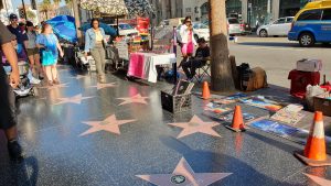 Brass stars embedded in sidewalks along 15 blocks of Hollywood Boulevard known as the “Hollywood Walk of Fame”