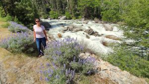 Becky admiring the views of Half Dome, Mt Broderick, and Liberty Cap; Mist Trail in Yosemite