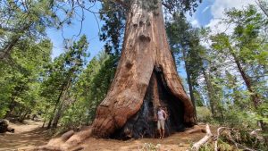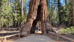 Becky at the base of the California tunnel tree; Mariposa Grove in Yosemite