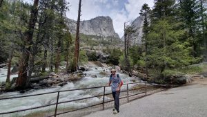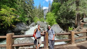 The sun reemerged as we hiked down from the mist trail for a photo at the Vernal Fall Footbridge; Yosemite