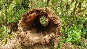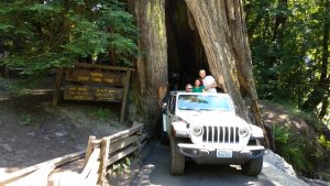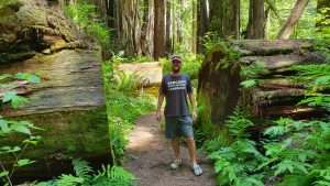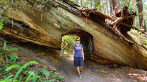 Becky walking through a tunnel carved in a giant fallen log; Redwood National Park