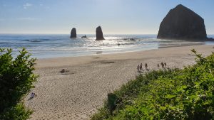 View of Haystack Rock, an iconic coastal rock formation at Cannon Beach