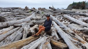 Becky on a collection of driftwood; Ruby Beach in Olympic National Park
