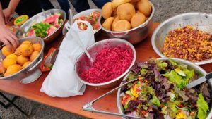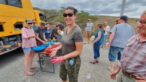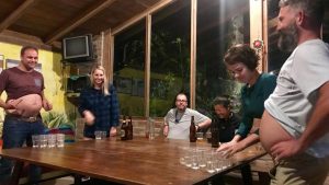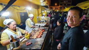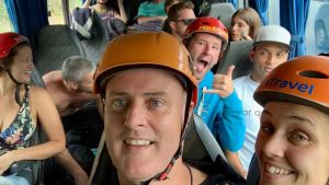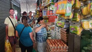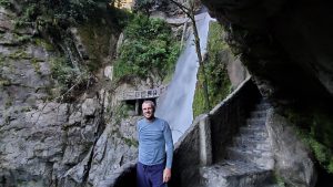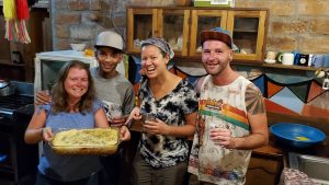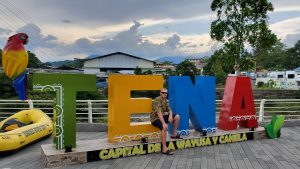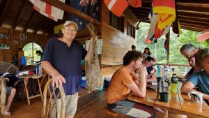 After breakfast, said goodbye to Tom/Charo and took the river boat back to the landing near the truck. Drove back towards Tena where the first two cook groups had to do shopping at the local market. From Tena, drove towards Banos, our home for the next 3 nights. Set up tents at our campsite and hiked to Pailón del Diablo waterfall. Finally had a chance to sort out our truck locker. Enjoyed Cook Group 1’s dinner of veggie/cheese pasta and garlic bread. The boys (Leo, Danny, Jeremy, Keith, Robby and Bert) did the crazy worm challenge and won a free bottle of rum and coke. O/n at Pequeño Paraiso (intermittent WiFi, kitchen, hot water showers, camp dogs/cat, bar)