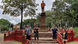 Jason, Hanna, Becky, Mitch and Emily striking a pose in front of the Chiang Kai Shek statue (founder of the Republic of China, also known as Taiwan); Ciudad del Este