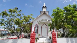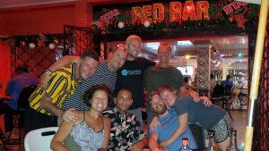 Lazy day today. We got up and were the first ones to breakfast (yummy fried dough balls), and then retreated to our room for the rest of the day. Even though the lady security guard told us to be at D’Urban Park at 7 am for the festivities, everyone else we talked to advised us to go in the late afternoon/early evening. Even Danny’s contact said it would be at 10 pm or midnight before the festivities kicked off so armed with the majority, we decided to take it easy today. By 5 pm, Jeremy and Rebeca were getting restless. Jeremy was running low on cash and he had walked all around town looking for a restaurant that would accept credit card. No luck and he was now starving since they both skipped lunch. So we agreed to an early dinner at OMG, which was just down the street. First a couple of beers though. Then a goodbye hug with Bert and Alli who are leaving tonight for the flight to Europe via NYC. Poor Bert still isn’t feeling 100% as he has been down and out these last two days. He will be spending his layover in NYC in a hotel room while Alli explores on her own. After hugging it out, we all walked over to OMG which did accept credit card. Jeremy got the buffet but the rest of us opted a la carte (pork chops and chips for Robby, alfredo pasta for Rebeca and buffalo wings for me). The food was dismal at best. Jeremy was happy but the rest of us were not. Buffalo sauce was slimy BBQ sauce and the wings were slimy and gross. Rebeca’s alfredo pasta was pasta with hardly any sauce. Georgetown has solidified itself as our least favorite town culinary wise…horrible food here! And super expensive too. We are not loving it. On the walk back, Rebeca opted out of joining the rest of us at the Red Bar. Lisa and Rob were having the time of their lives there, having drunk two bottles of El Dorado, “the world’s best rum”. In fact, Lisa was already planning their wedding and Rob was happily agreeing. We all promised to go to their wedding, which would be a destination wedding in Hawaii. Not sure they are going to remember this conversation tomorrow but we’ve never seen Lisa and Rob look so happy together! Around 10 pm, we walked over to D’Urban Park and to our dismay, discovered that the flag raising ceremony had been this morning! Boo, we missed it. So we were back in bed before midnight.