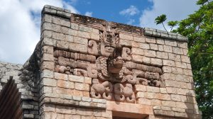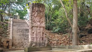 Stelae at the base of steps leading to a Mayan temple; Maya Key