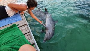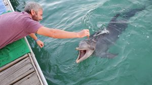 Robby's turn to play fetch as a friendly dolphin brings him a seaweed gift