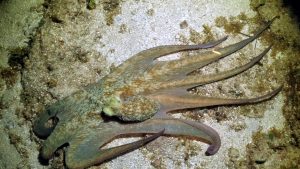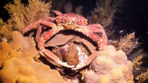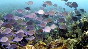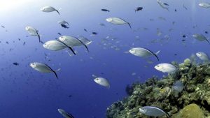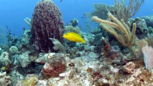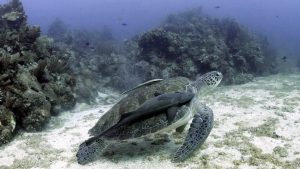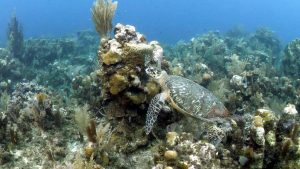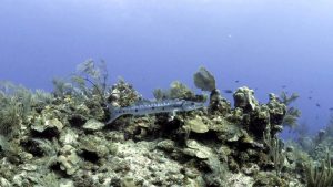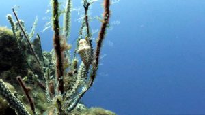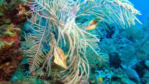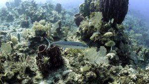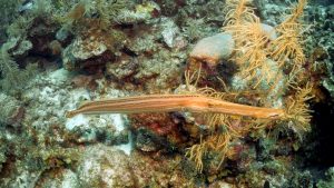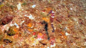 Longnose seahorse swimming to a coral formation on The Odyssey shipwreck