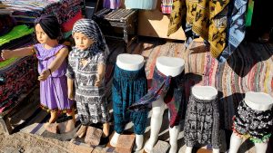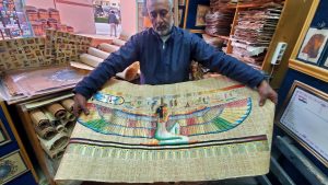 The friendly owner of this papyrus store displays the ancient Egyptian winged goddess Isis