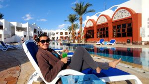 Becky taking advantage of free drinks at our all inclusive resort, Sharm Inn Amarein