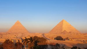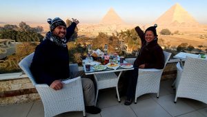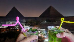 Welcome drinks at the rooftop bar of our hotel where we could watch the sound and light show for free; Panorama Pyramids Inn