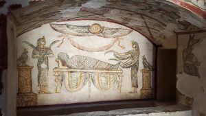 Funerary scene of Anubis mummifying a body; Catacombs of Kom el Shoqafa