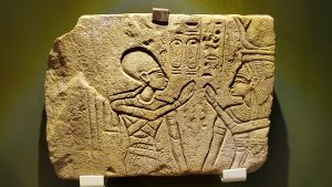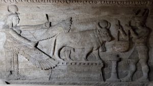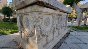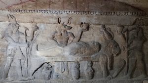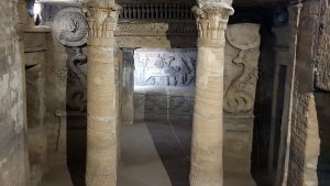Carved stone detail on a sarcophagus at the Catacombs of Kom El Shuqafa
