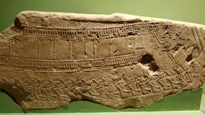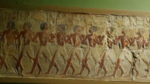 Painted relief of light infantry soldiers carrying standards, battle axes and palm fronds; National Military Museum
