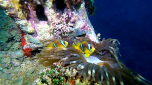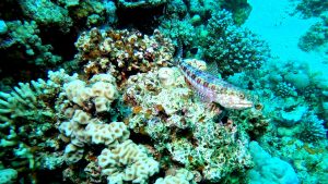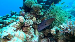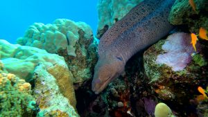 A giant moray eel being cleaned by a bluestripe cleaner wrasse; Ras Ghozlani