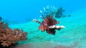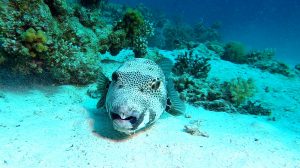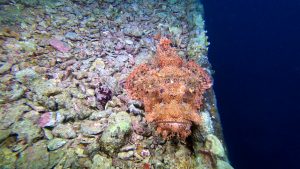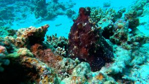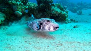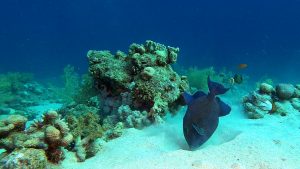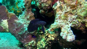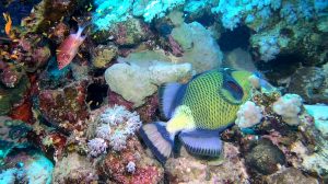 Titan triggerfish wedging itself into a crevice to sleep; Yolanda Reef