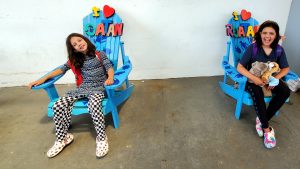 Emma and Grace sitting in Adirondack chairs at the airport in Roatan