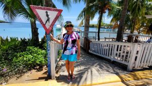 Ann next to a “yield to SCUBA divers” crossing sign