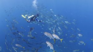 Dive master Edwin surrounded by horse-eye jacks