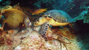 A French angelfish hovers near a grazing turtle with a Spanish hogfish in the background