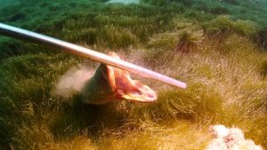 Stargazer snake eel snapping at a lobster tickle stick