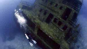 Luke diving next to The Odyssey shipwreck