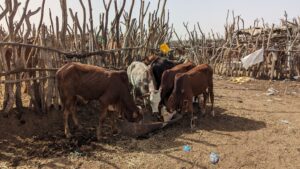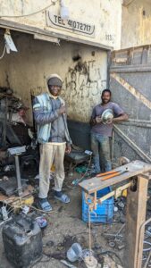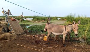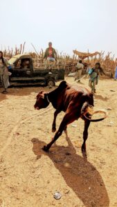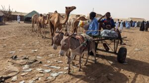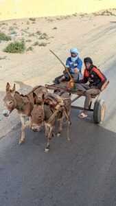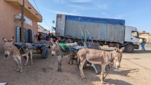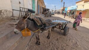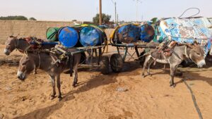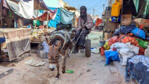 A donkey cart carrying steel drums through the Nouakchott camel market