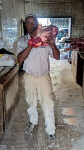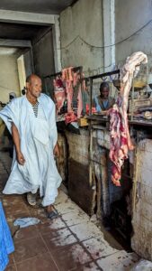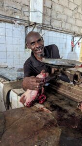 A meat seller shows off a large chunk of meat for sale; Nouadhibou Meat Market