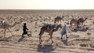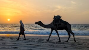 A cameleer at a beach on the outskirts of Nouakchott; Les Sultanes campsite