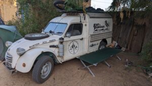 Citroën 2cv van at our campsite in Atar, the Auberge Bab Sahara