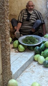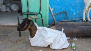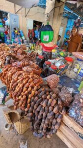 Friendly Mauritanian men showcase an animal skin stuffed with date paste; Atar morning market
