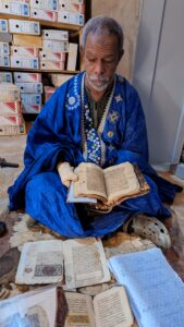 Librarian showing us ancient texts from one of Mauritania's five ancient Saharan libraries in Chinguetti