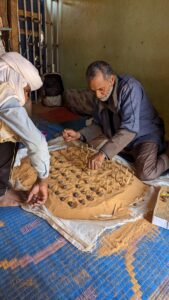 Two men playing Zamma, which is played on a quadruple Alquerque pattern (Arabic Alquerque is the forefather of checkers) using sand, sticks and camel dung!