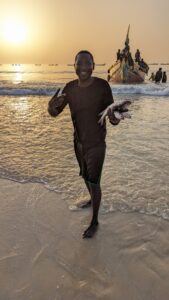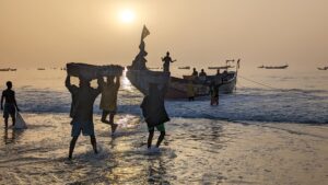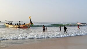 A bustling beach as fishing boats (pirogues) return overladen with fish; Nouakchott fish market