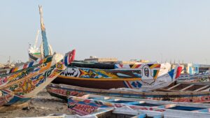 Colorful Senegalese pirogues line the beachfront at the Nouakchott fish market