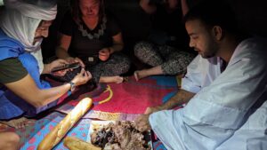 Enjoying a traditional meal of barbequed camel meat beneath the stars with our new Mauritanian friends, Mohammed and Moulay
