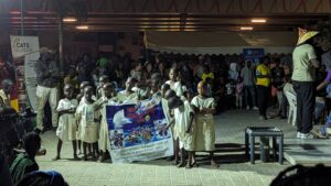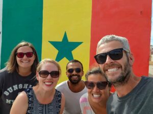 Group photo in front of the Senegal flag with Chloe, Lauren and Dan