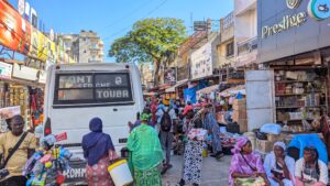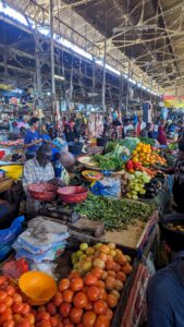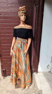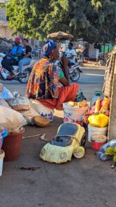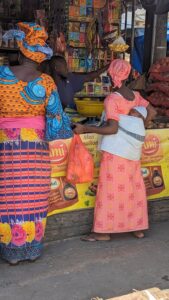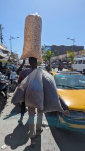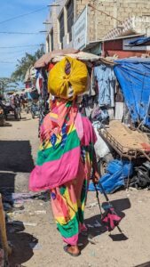A lady wearing a colorful outfit balances a bag on her head at the Saint Louis market