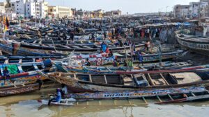 Colorful pirogues as far as the eye can see on the Senegal River in Saint Louis