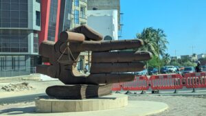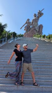 Mimicking the pose of the African Renaissance Monument, a 171 foot tall bronze statue located on the outskirts of Dakar