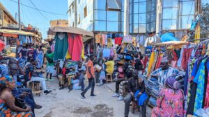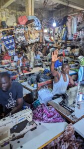 A literal sweatshop where over a dozen men are crammed in together to sew clothes in a tiny workshop; Dakar