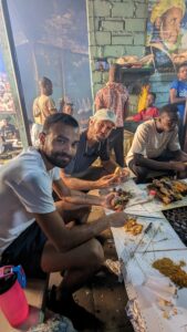Dan and Robby eating yummy grilled meat at Bantyii Dibiterie in Dakar