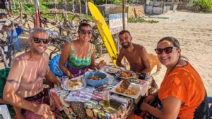 Enjoying our caldou meal (a traditional dish from Casamanace, a region in Southern Senegal of a fish based stew made with pepper, maggi, gambo, bissap leaves, onions and garlic and served on lemon rice) with Dan and Chloe; Cap Skirring