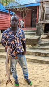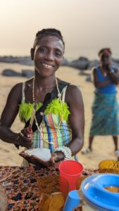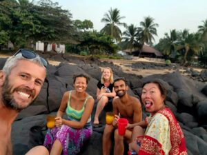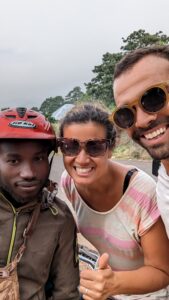 Smiling with our motorbike taxi driver who dropped us off at Bureh Beach