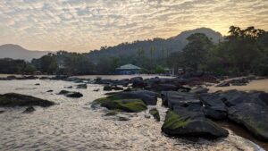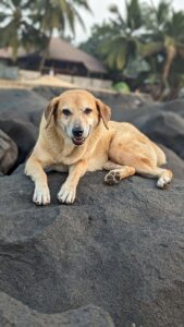 A resort dog joins us to watch the pretty sunset at Bureh Beach