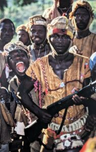 Photo of the kamajor militia wearing traditional ronko "war vests" with protective amulets and cowrie shells; National Museum