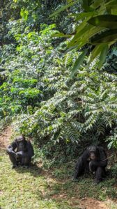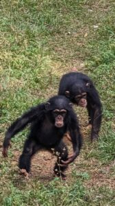 A pair of chimpanzees in the adult chimp enclosure at Tacugama
