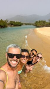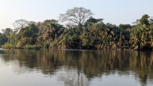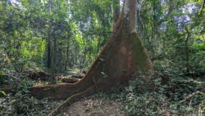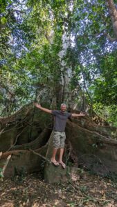 Robby striking a pose on a tree's massive roots; Tiwai Island